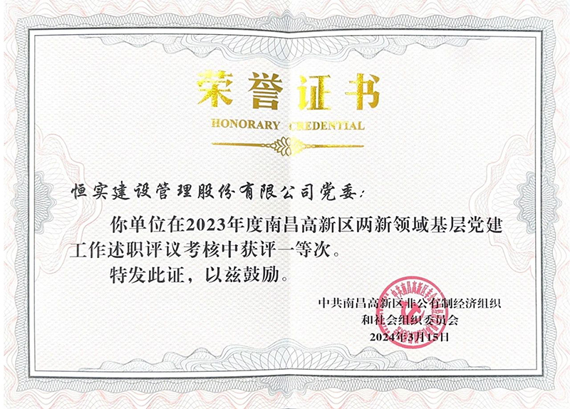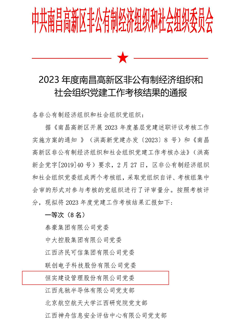 3月26日,中共南昌高新区非公有制经济组织和社会组织就2023年度南昌高新区非公党建工作考核进行了结果通报:中共米兰官方网站委员会荣获一等次!自公司党组织成立以来,已连续五年荣获南昌高新区非公党建考核一等奖,充分体现了高新区对恒实股份党建工作的肯定与支持,也是全体恒实党员奋勇争先、积极进取的结果!