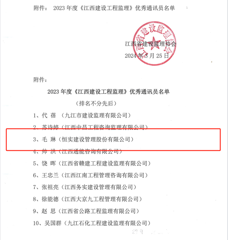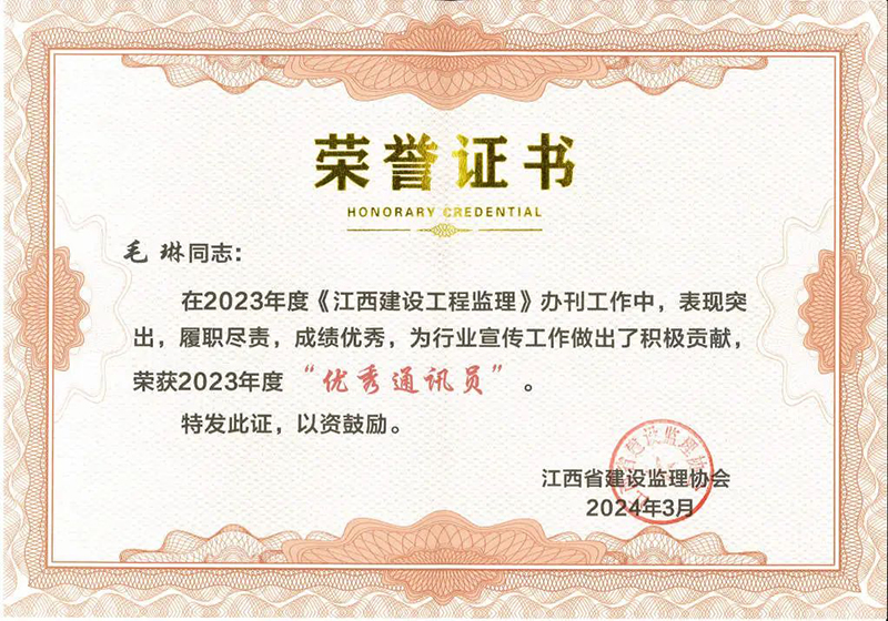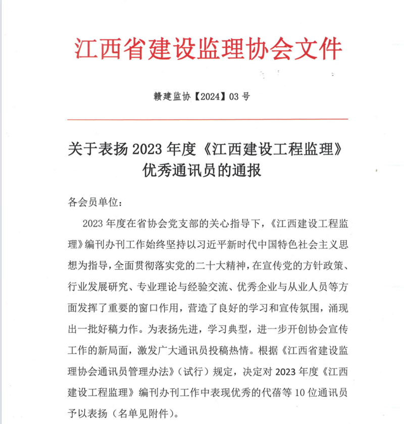 近日,江西省建设监理协会发布了《关于表扬2023年度<江西建设工程监理>优秀通讯员的通报》,根据《江西省建设监理协会通讯员管理办法》(试行)规定,决定对2023年度《江西建设工程监理》编刊办刊工作中表现优秀的10位通讯员予以表扬,其中米兰官方网站毛琳榜上有名,被评为优秀通讯员。