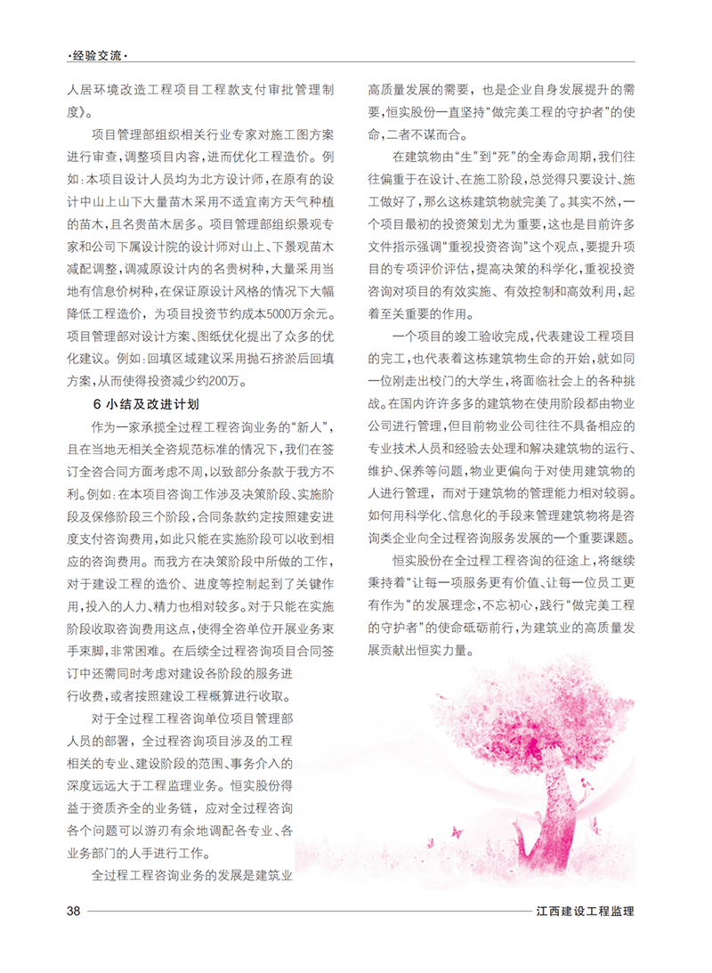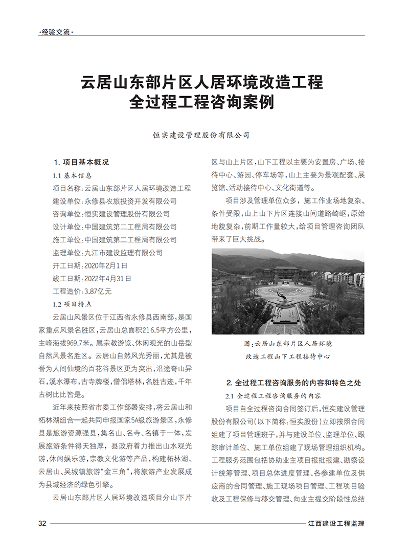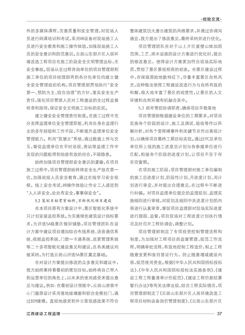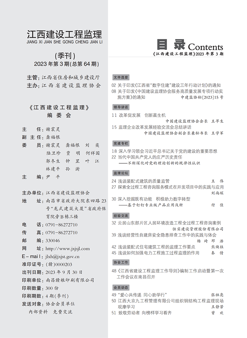2023年度在省建设监理协会党支部的关心指导下,《江西建设工程监理》编刊办刊工作始终坚持以习近平新时代中国特色社会主义思想为指导,全面贯彻落实党的二十大精神,在宣传党的方针政策,行业发展研究、专业理论与经验交流、优秀企业与从业人员等方面发挥了重要的窗口作用,营造了良好的学习和宣传氛围,涌现出一批好稿力作。公司《云居山东部片区人居环境改造工程全过程工程咨询案例》刊登在“经验交流”栏目中作为全过程工程咨询项目的典型案例重点推介。