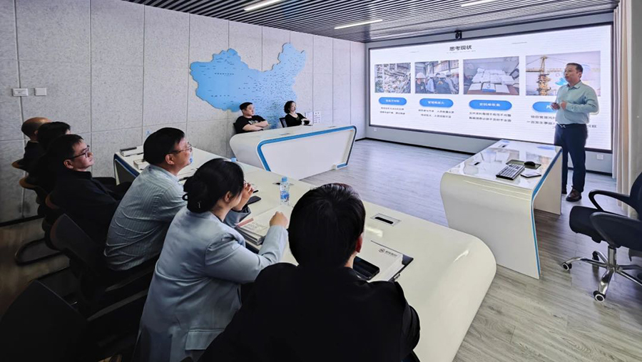 在企业指挥中心,欣恒科技总经理王轲介绍了公司数字化发展历程及“筑慧云”——建筑产业智慧化云平台,讲解了公司基于建筑全生命周期的“1+2+N”智慧全过程工程服务解决方案,展示了公司自主开发的“易履职”APP在项目日常巡检,资料生成等方面的实际运用。