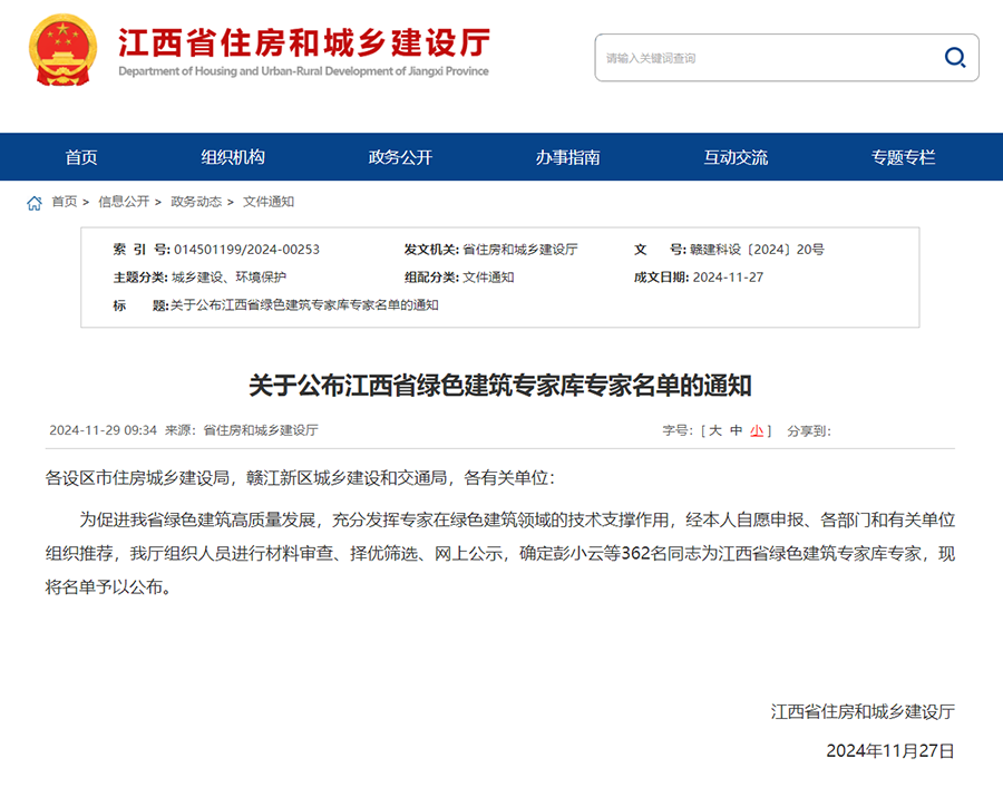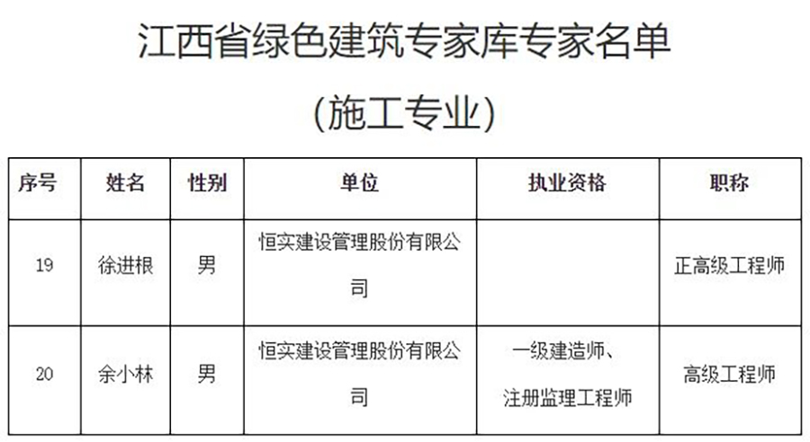 为促进江西省绿色建筑高质量发展,充分发挥专家在绿色建筑领域的技术支撑作用,11月27日,江西省住房和城乡建设厅发布了《关于公布江西省绿色建筑专家库专家名单的通知》,经过材料审查、择优筛选、网上公示等工作,米兰官方网站徐进根、余小林两位高级工程师入选江西省绿色建筑(施工专业)专家库。
