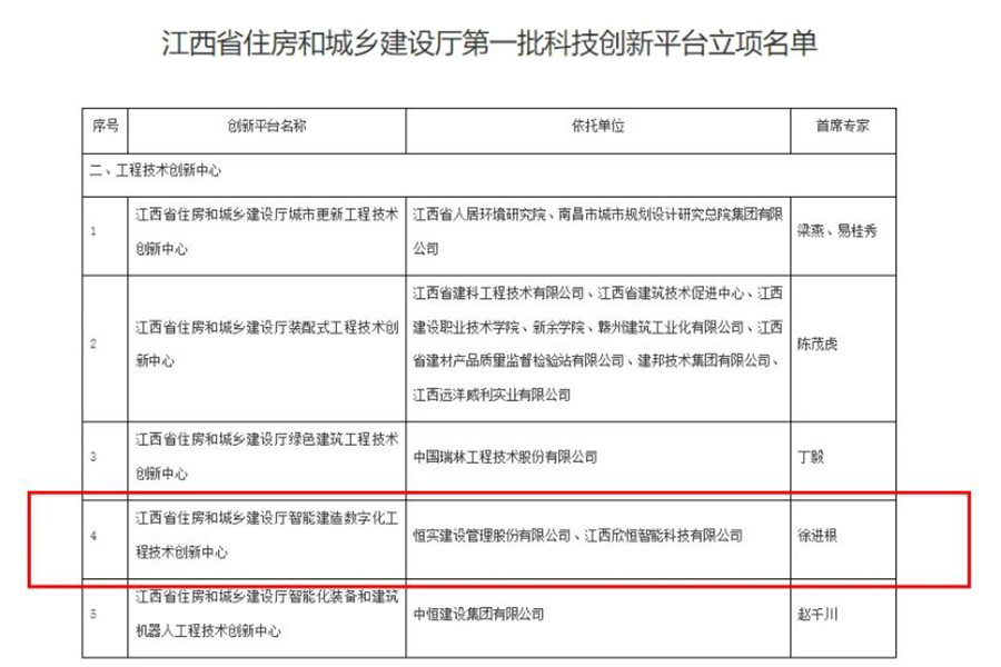 近日,江西省住房和城乡建设厅公布了第一批科技创新平台立项名单。其中,由米兰官方网站和全资子公司江西欣恒智能科技有限公司共同申报的江西省住房和城乡建设厅智能建造数字化工程技术创新中心成功获批立项。